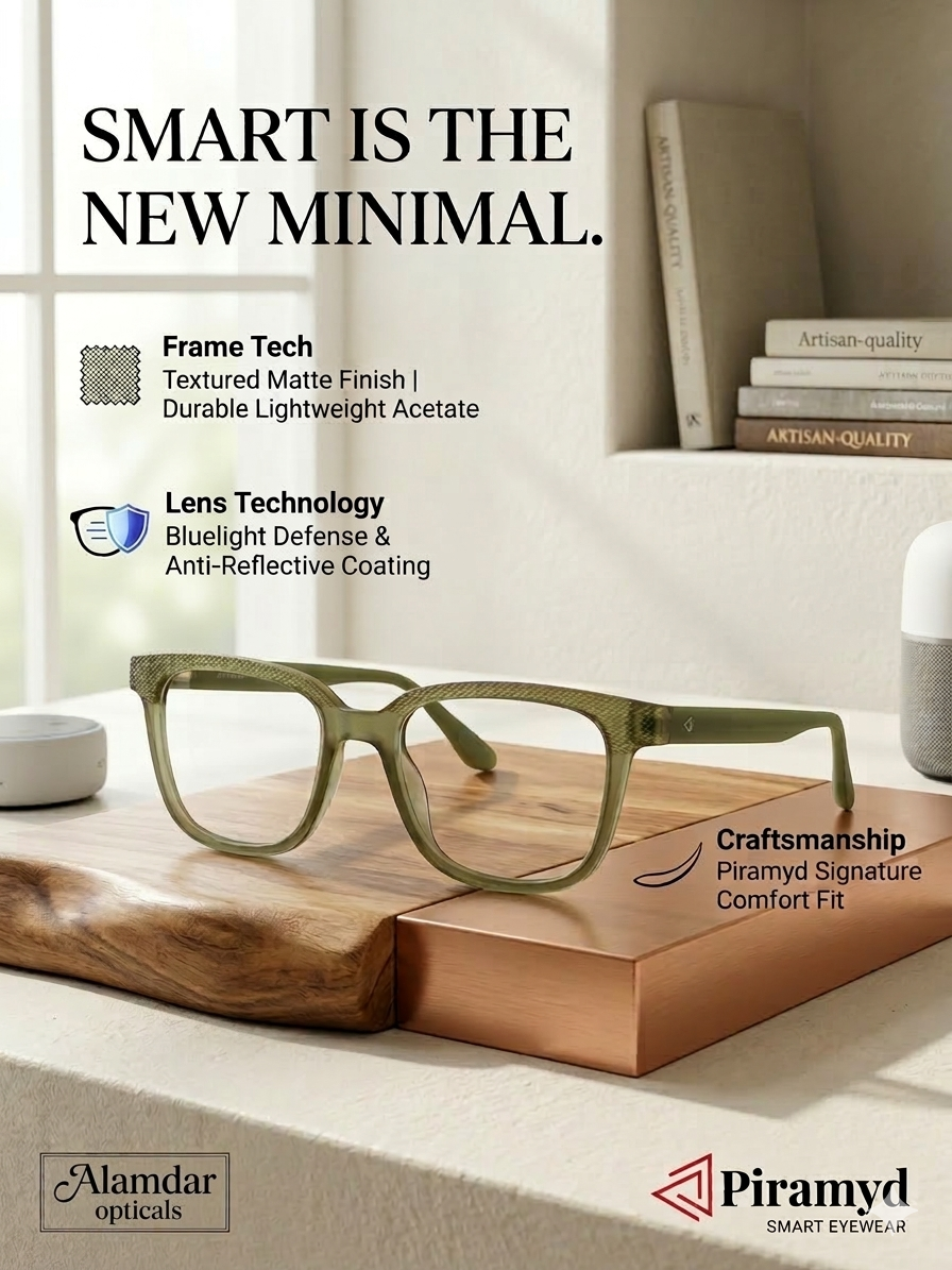 👓Elevate your everyday look with this premium Piramyd Smart Eyewear frame in a stylish matte green finish. Designed with a modern square shape, it complements various face types while adding a clean, sophisticated touch to your style.